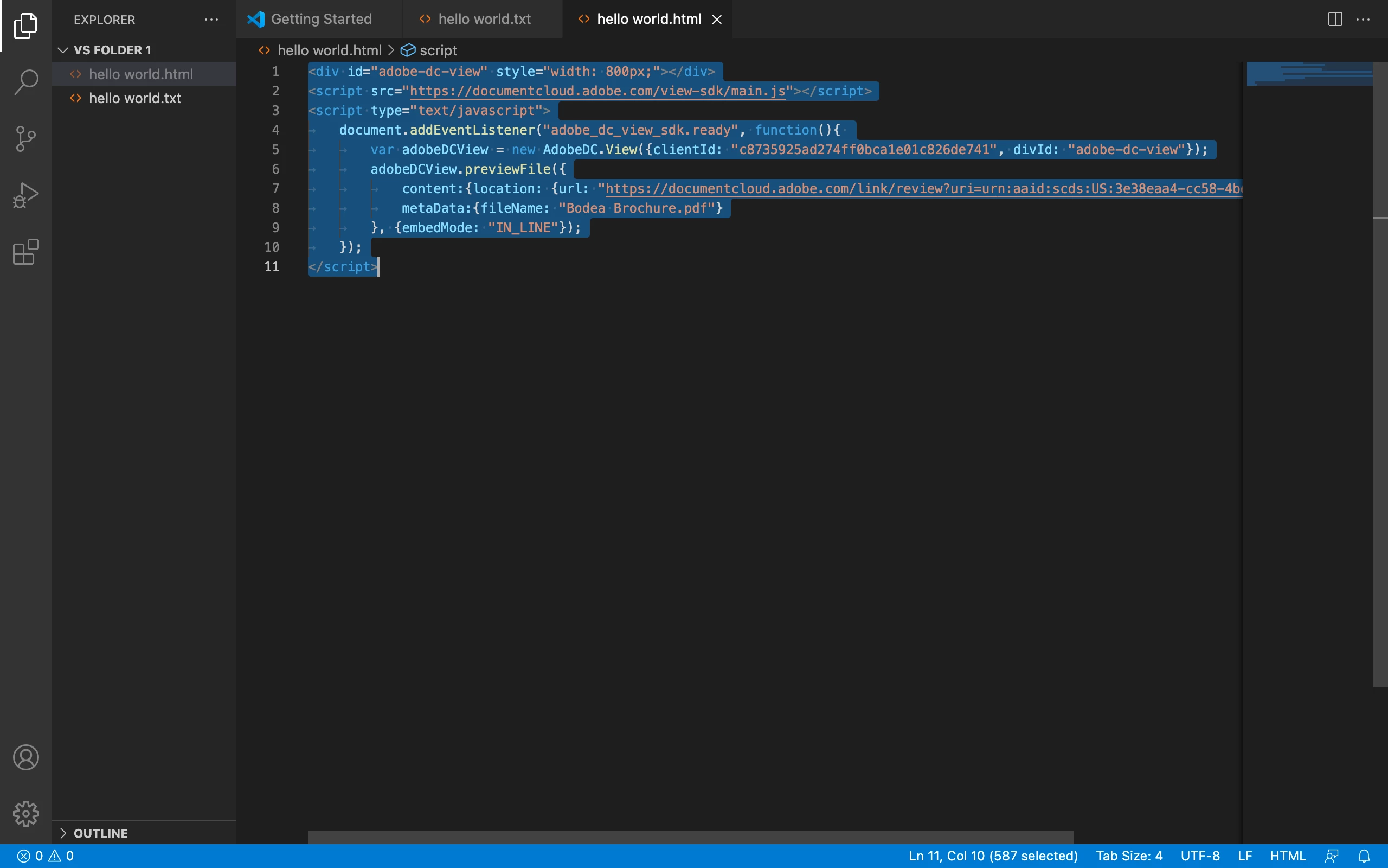 2. When I use the PDF Embed API Demo and generate the code, I copy it into VSCode, change the Client ID to my API key that was generated for my domain which I get in my Adobe Developer Console under the project I'm working on. From here I can open the .html in my browser and see the PDF the way I want it. But I want to use my PDF. I cannot seem to get this to happen. I've confirmed that my client ID works and that I can embed PDF into my domain.