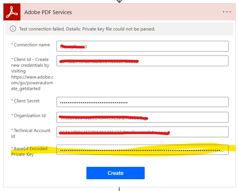 Power Automate - Adobe PDF Service API - No Private Keys Available