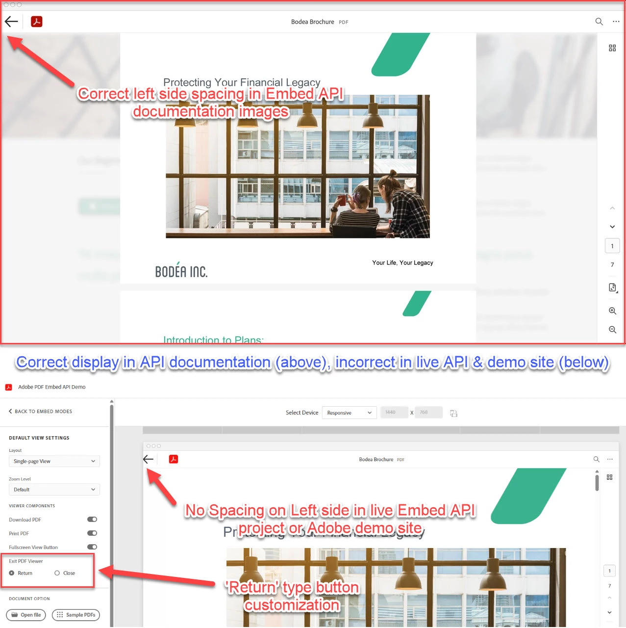 Using the Embed API in Light Box mode and using the viewerConfig to set the ExitPDFViewerType button customization to 'Return' (rather than the default 'Close'); The return button has no margin/padding on the left side.