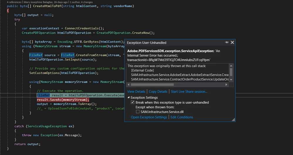 We're receiving error ServiceApiExcepption after getting bytes[] from converting html to pdf. Sometimes it works without throwing any error but somtimes when converting a lot of data it thrown error. Is there any limits or quota in converting even if we have a licensed.