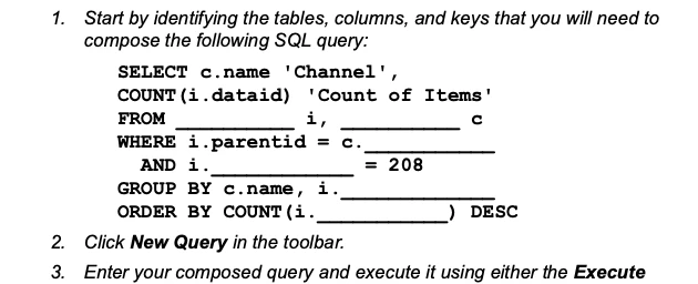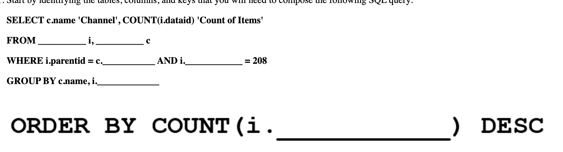 GROUP BY c.name, i._____________ ORDER BY COUNT(i.___________) DESC