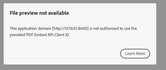 This application domain (http://127.0.0.1:8000) is not authorized to use the provided PDF Embed API