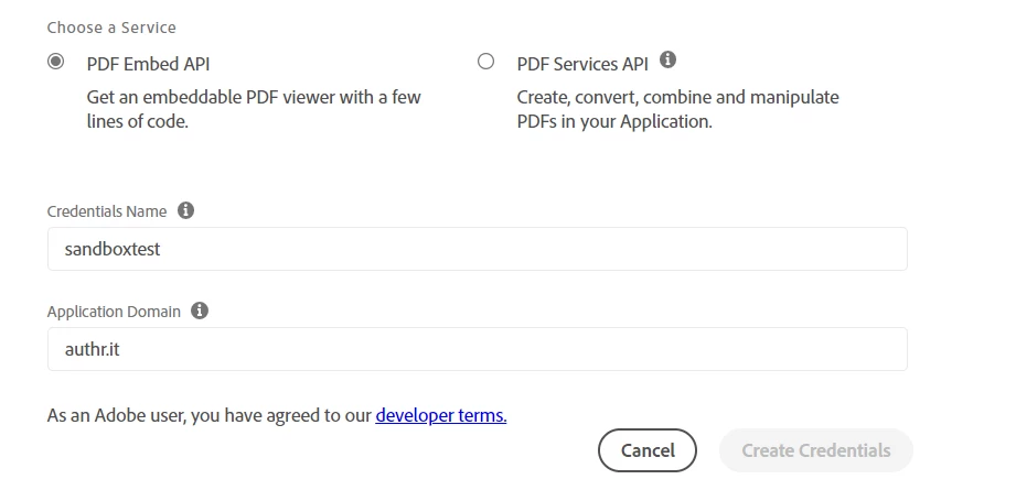 Newbie to the embed API here - trying to create a credential to test the embed PDF API, but I'm getting an internal server error - try again no matter what I try. (The domain is a valid one - I tried google.com and others without success as well.)