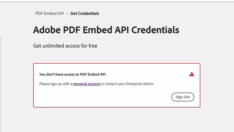 Unable to "Get Credentials" for Adobe PDF Embed API