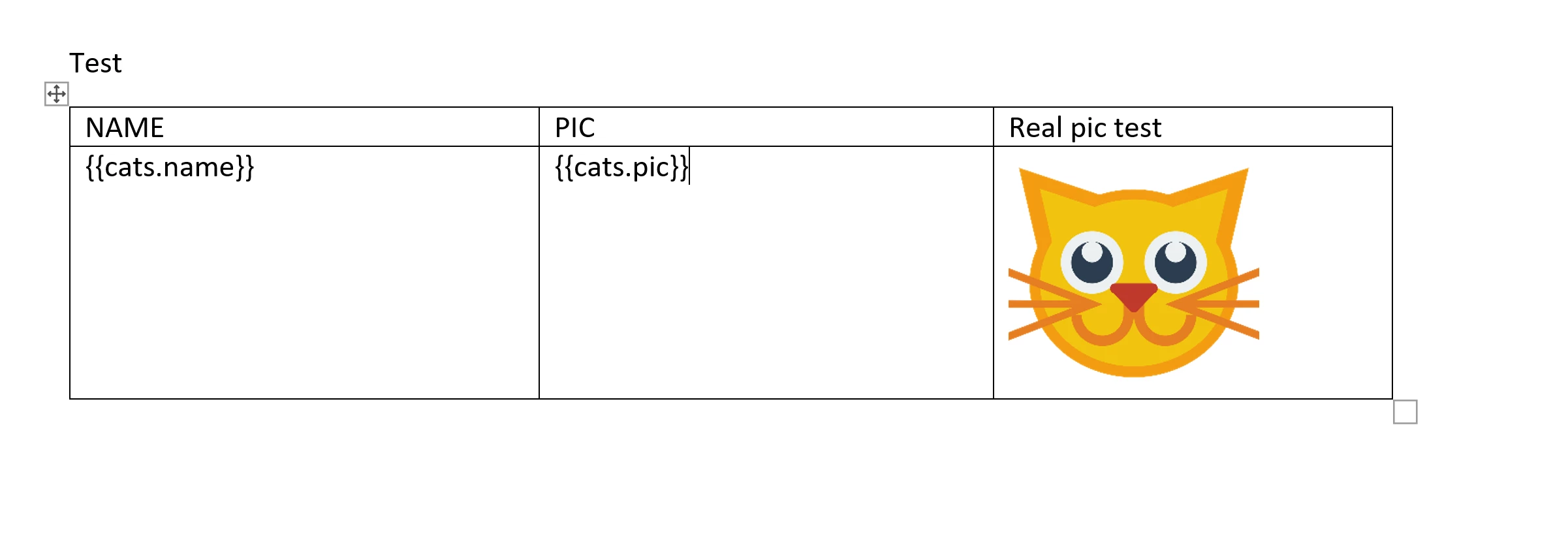 Now, for my test, I wanted to leave the pic column alone, just so I could ensure it was getting the right URL. So I used Word's table editing to add a third column to the right. Again though that was just for testing. At this point I had a table where the first column specified {{ cats.name }}, the second {{ cats.pic }}, and the third was empty.