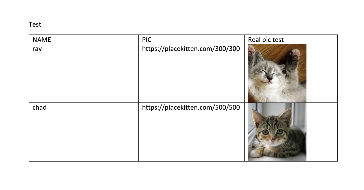 * My sample data uses images from a Cat placeholder service and are different sizes. But in Document Generation, the images are all the same size - the size they are in the Word template. If my images were truly random sizes and stuff, that wouldn't work well. I'd use a consistent size.
