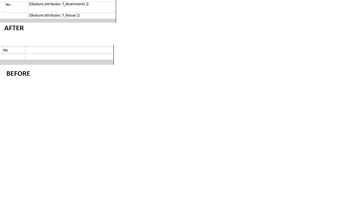 My body only includes fields with values, prior to this change the variablelike , {{feature.attributes.`fcomments`}}, would be removed if the field was not found (due to a null value). Now my report keeps the variable {{feature.attributes.`f_3comments`}} .