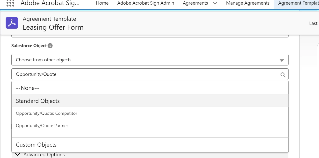 I am not getting object name Opportunity  in the list of salesforce objects when I am creating agreement Template. I am seeing Opportunity/Quote:Competitor and Opportunity/Quote Partner in options.