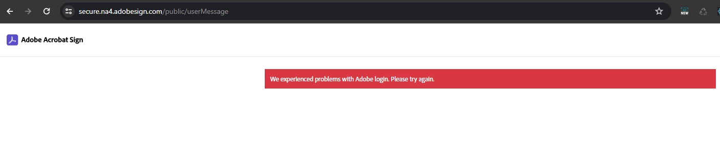 Eexample userParticipantForum|Forum|1 year agoFebruary 22, 2024QuestionLogin ProblemForum|Forum|1 year agoFebruary 22, 20240 replies88 viewsGetting this issue: We experienced problems with Adobe login. Please try again. from last 2 daysAcrobat SignAdobe SignAdobe Sign DeveloperAcrobat Sign DeveloperEchosign