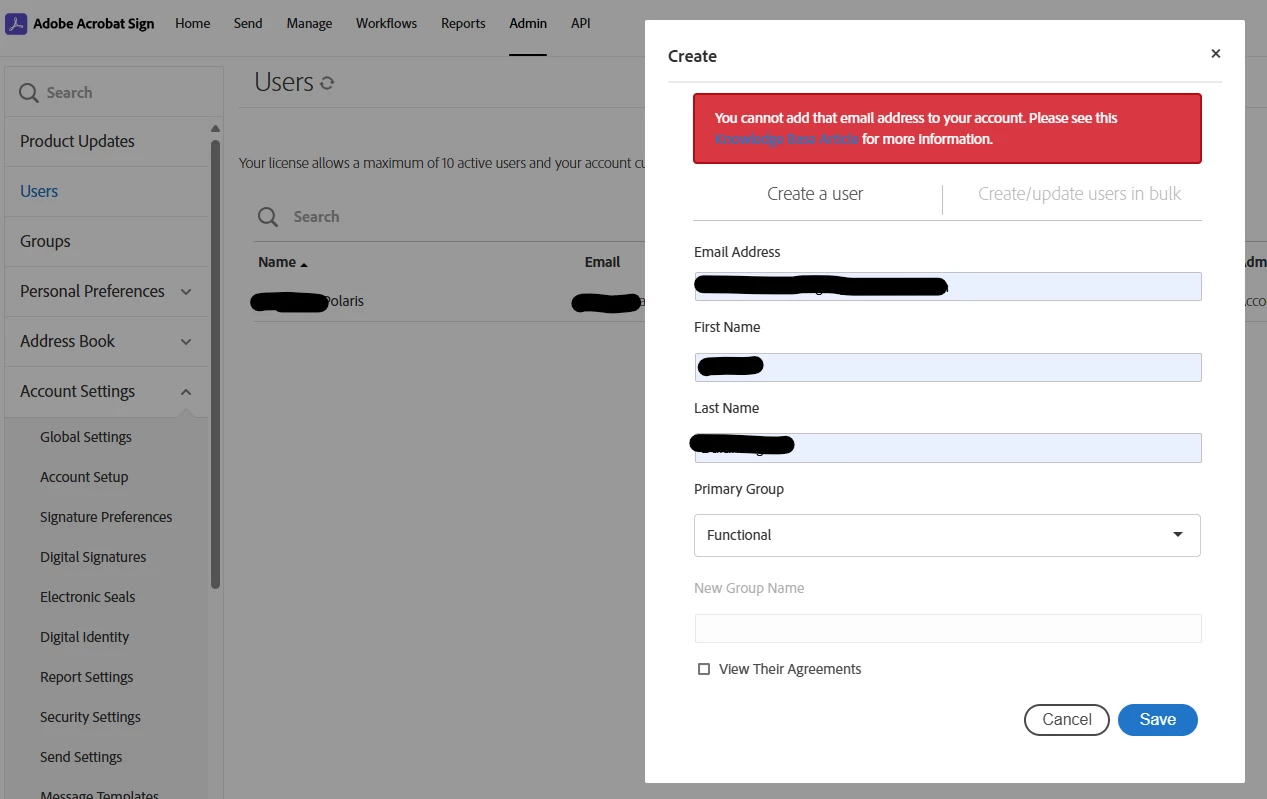 As admin console, I am unable to add user by following the user guide. Kindly refer to the attached screenshot. I'm using the free version of DEV adobe acrobat sign. Please asisst.