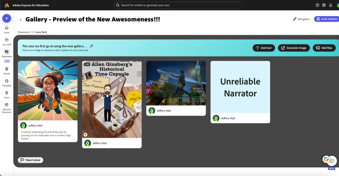 One thing I love to say is, "Push all the buttons and play to learn!" This has become my mantra when creating or exploring features. In Adobe Express for Education, you truly have endless creative possibilities at your figertips - and this new Homepage experience makes it even easier. Whether you want to generate an image with AI, use a Guided Activity with built-in instructions, animate a character, create a webpage, create a video or drive your own professional learning with our self-paced course, it's all right there for you. I encourage you to explore the new Homepage and click on each tab to get a feel for the experience.