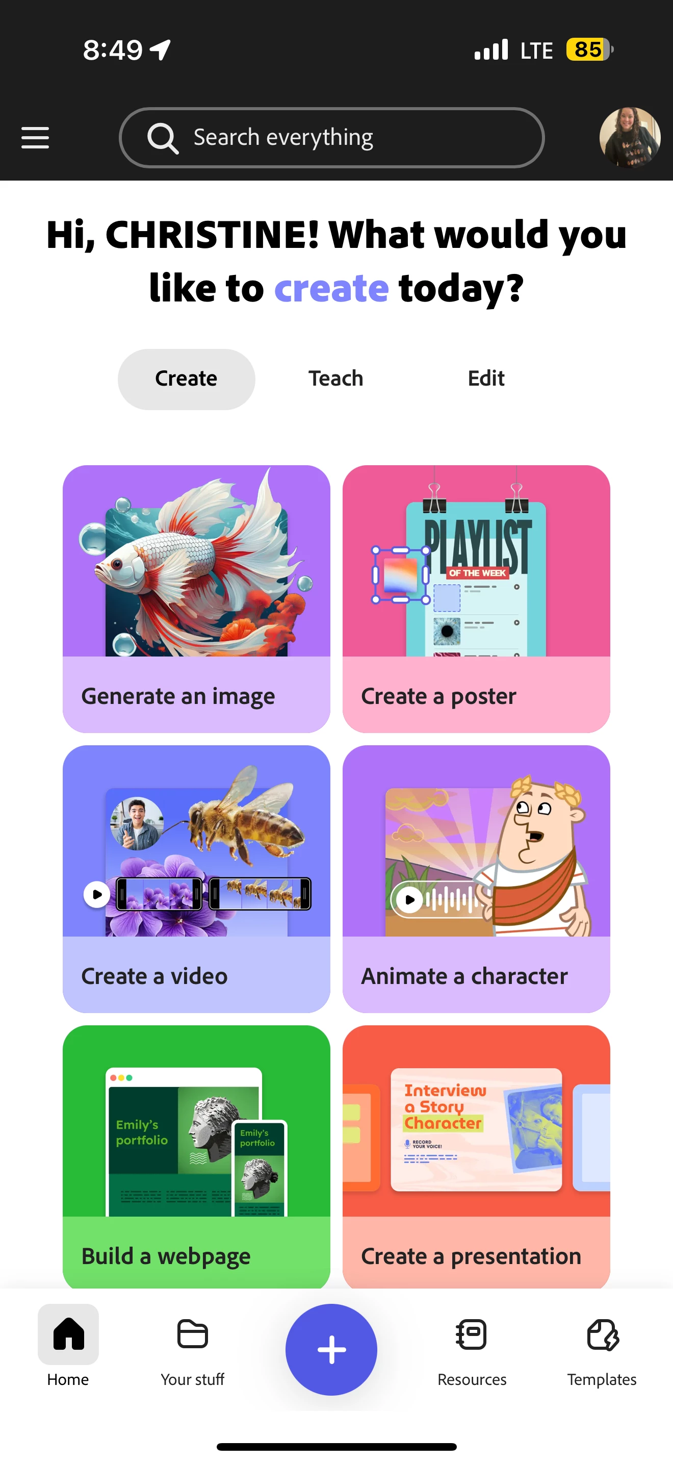 Built with feedback from teachers and students, creativity is now just a click away! When you open Adobe Express for Education, you'll be greeted with a dynamic new Homepage experience that gives you quick access to Create, Teach and Edit - plus all the learning opportunities that you love from Adobe Express.