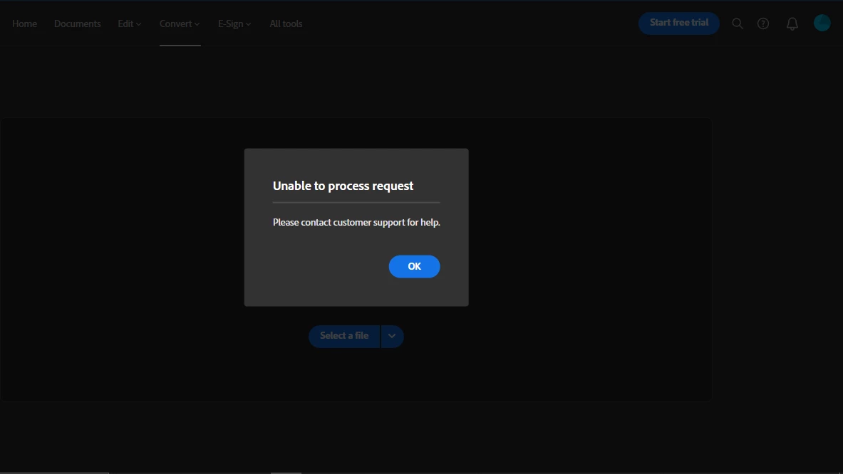 Adobe Acrobat Online - Unable to process request - please contact customer support for help