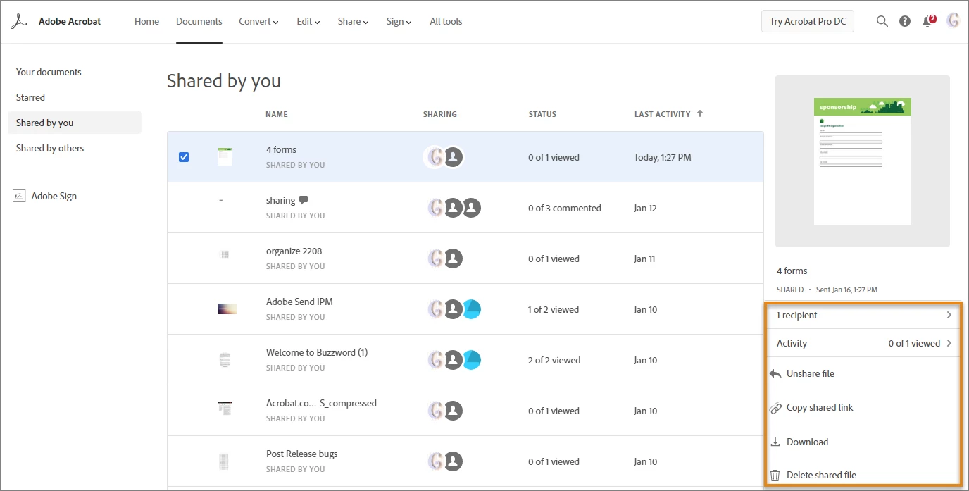 - In the top-menu bar of Adobe Acrobat home, click Document > Shared By You. All the files shared by you are displayed along with the following information:
