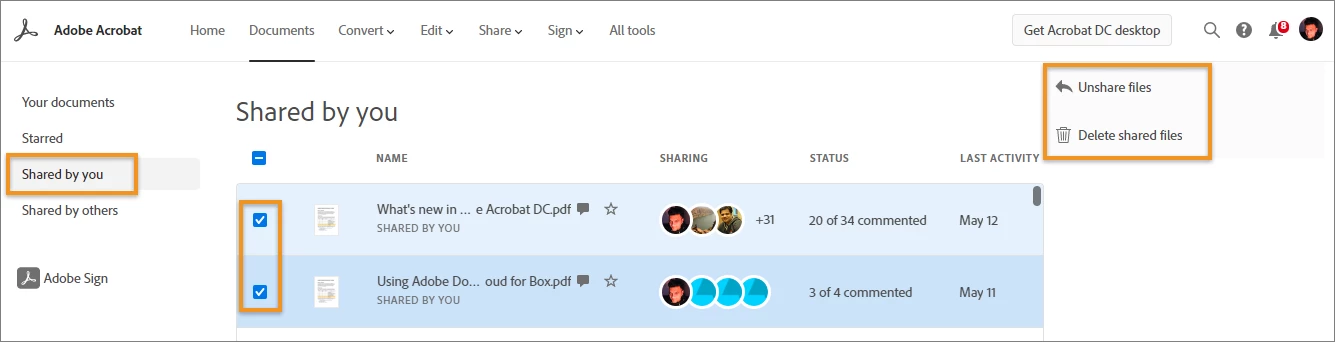 In the top menu bar of Adobe Acrobat home, click Document > Shared By You. Select the files you want to unshare or delete. In the right pane, do the following: