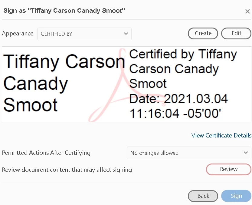 I have a user who certified her document but a message appears stating signature invalid. Also, instead of displaying CERTIFIED BY the signature shows DIGITAL SIGNATURE. I also tested and received the same results. How can we ensure the signature displays CERTIFIED BY TIFFANY CARSON? Your responses are greatly appreciated. We are on a tight deadline. Thank you Tiff
