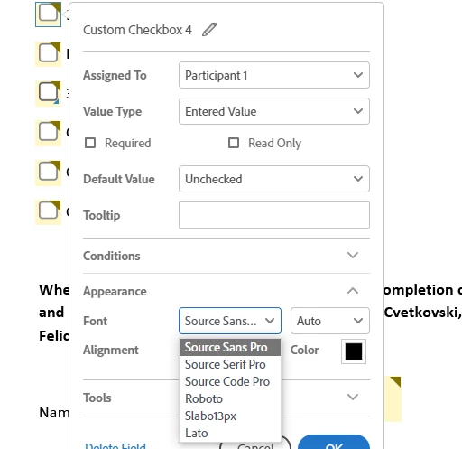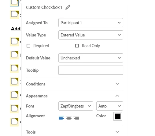 Hi, I have a problem with my clickable checkboxes on my templates changing from check marks to black squares once saved. I noticed that when I create the template the font for the checkbox is zapfdingbats, however once saved it changes to Sans and I am not sure what to do. I am using Adobe Acrobat online with a paid work account. When I send the template for signatures the person can click the box and make checkmark, however once it is returned to me it is just a black square. Thank you.
