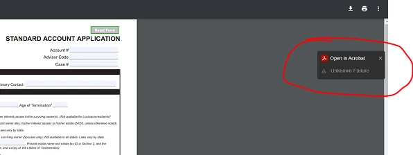 Im assisting someone that no longer has access to the "Open in Adobe" button in Google Chrome. For some reason Adobe Reader DC was reinstalld and that is when the button became no longer available. I have looked into adding the chrome extension but this has changed the UI of the PDF viewer in Chrome so I disabled it, back to square one.
