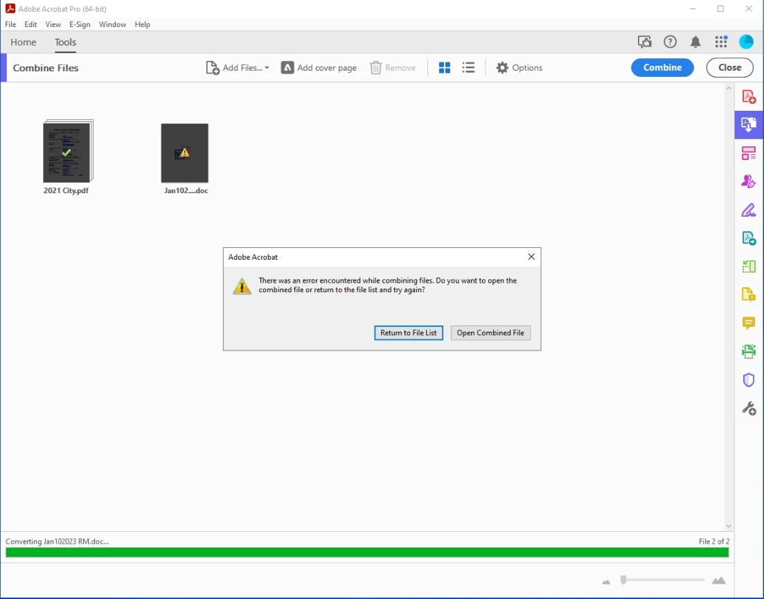 When trying to combine files using Adobe Acrobat Pro I recieve an error message stating that there was an error encountered while combining files. This happens to any document that is not in PDF format and it happens if the file is located locally or on a network share. I have tried multiple solutions posted in other forums but nothing seems to work. I have uninstalled and reinstalled Creative cloud and Acrobat. Ran the repair installation option. Removed multiple registry keys possibly related to the issue. Rebooted multiple times during these tasks. Tried running the program as an administrator and in compatability view. Nothing seems to have fixed the issue. I will add screenshots of the version of adobe and OS.