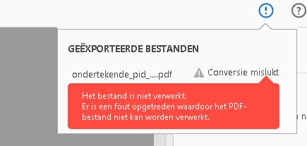 Na een aantal weken zonder problemen documenten converteren, krijg ik nu bij elke pdf die ik wil converteren een foutmelding. Het converteren start wel, maar wordt na ongeveer 10 seconden afgebroken met de melding Conversie mislukt.