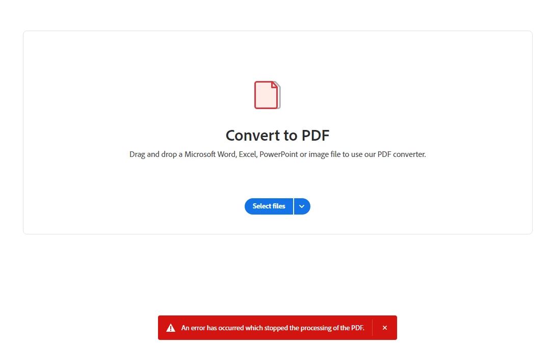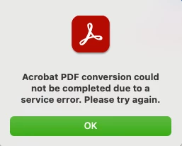 I have suddenly encountered problems in converting a document from Word to pdf. Earlier versions of the same document have converted with no problem. When I try and convert now the process gets almost to the end and then changes to another screen (see attachment) asking me to upload the document again. This gets to the same stage and I then get a message to say an error has been encountered. The file has increased in size from previous versions and is now 25 MB so is within the limits. Can anyone help please? Thank you.