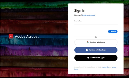 - Open a browser, sign-in to Acrobat web using your Adobe ID and password or social (Facebook, Google, or Apple) account.