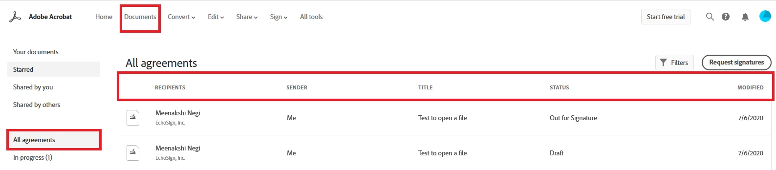 - All Agreements: By clicking on this option, it will display the list of all the sign agreements. You can check the status of each document under the Status column.