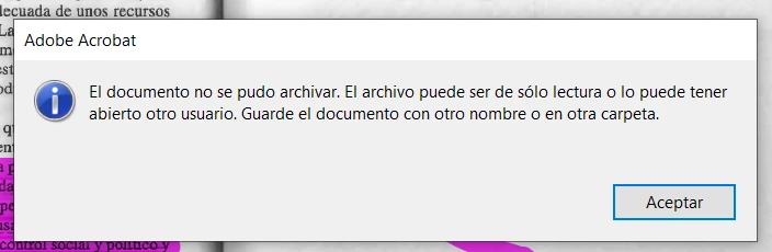 Hace unos días viene apareciendo este error en mis documentos pdf al guardarlos con modificaciones (resaltar texto):