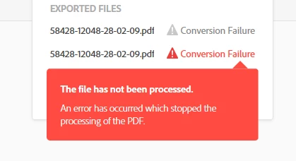 You can also refer and try the suggestion from the following Adobe article File conversion error | Adobe Export PDF