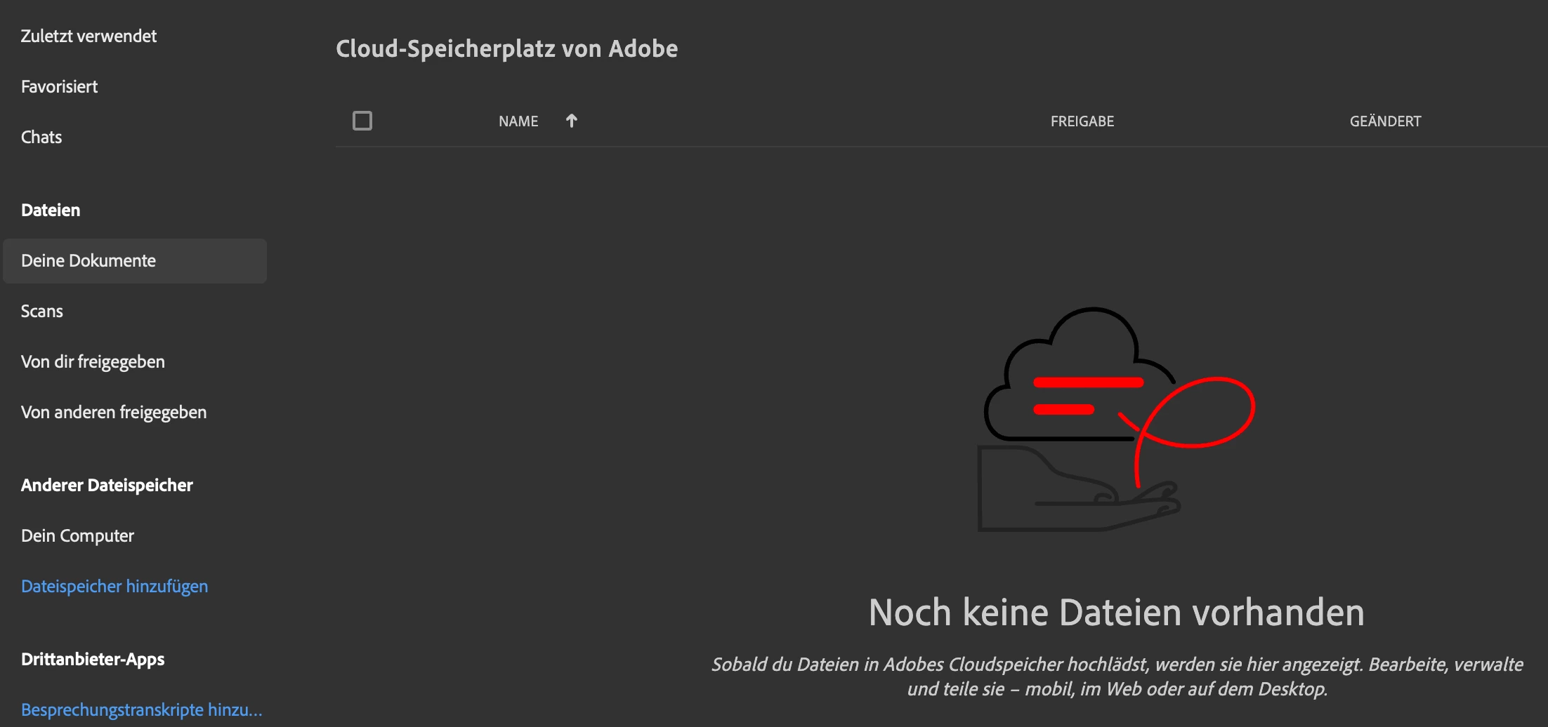 ich habe ein PDF im Cloud-Speicherplatz unter "Deine Dokumente" versehentlich gelöscht und versuche dieses wiederherzustellen, finde allerdings weder in der Desktop-Version (Windows & Mac getestet) noch Online unter Adobe Acrobat einen Ordner namens "gelöscht" oder ähnlichem (im Gegensatz zum Creative Cloud-Speicherplatz, um den es hier nicht geht).