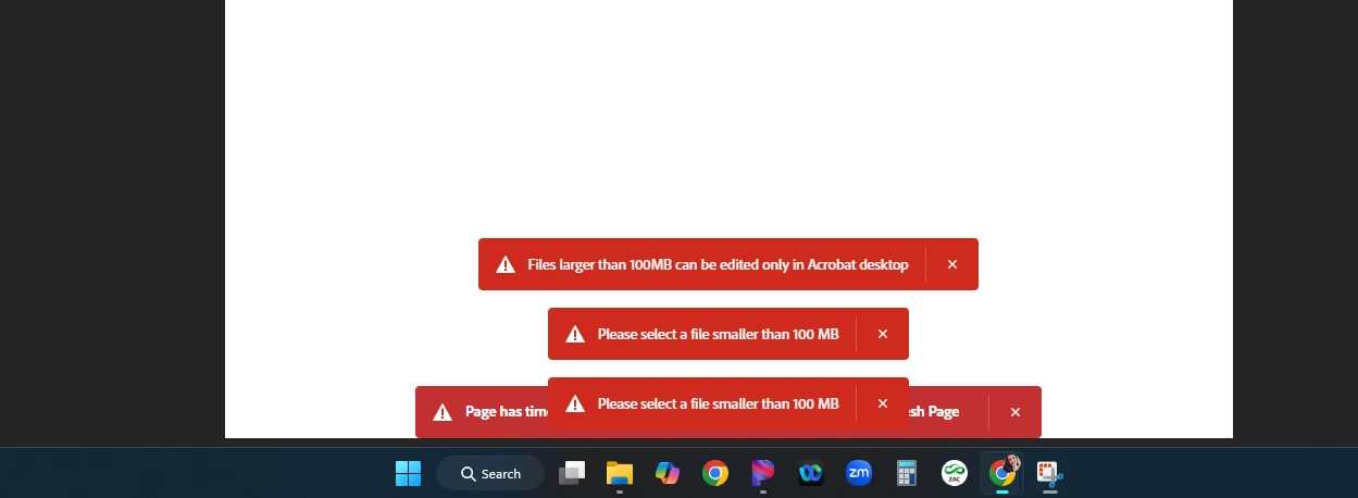 VVH_123ParticipantForum|Forum|8 months agoJune 12, 2025QuestionHelp with Adobe Acroba WebForum|Forum|8 months agoJune 12, 20251 reply134 viewsI was working in Acrobat, organizing/deleting documents and everything was fine. Now it won't let me and it says the file is large when in fact I deleted documents and it's the same documents we always uploadEdit and convert PDFs
