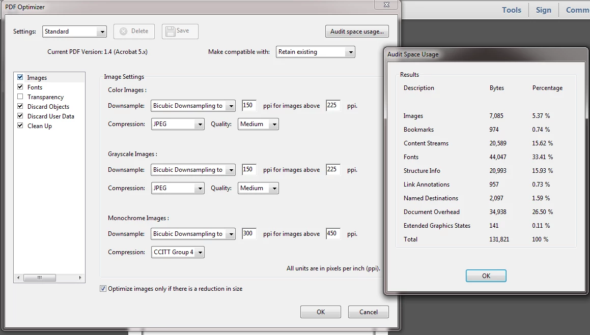 Vous pouvez aussi aller à Acrobat > Enregistrer sous un autre > pdf optimisée et puis cliquez sur le bouton ' audit utilisation de l'espace »pour savoir ce qui se occupe l'espace dans le pdf et ajuster en conséquence