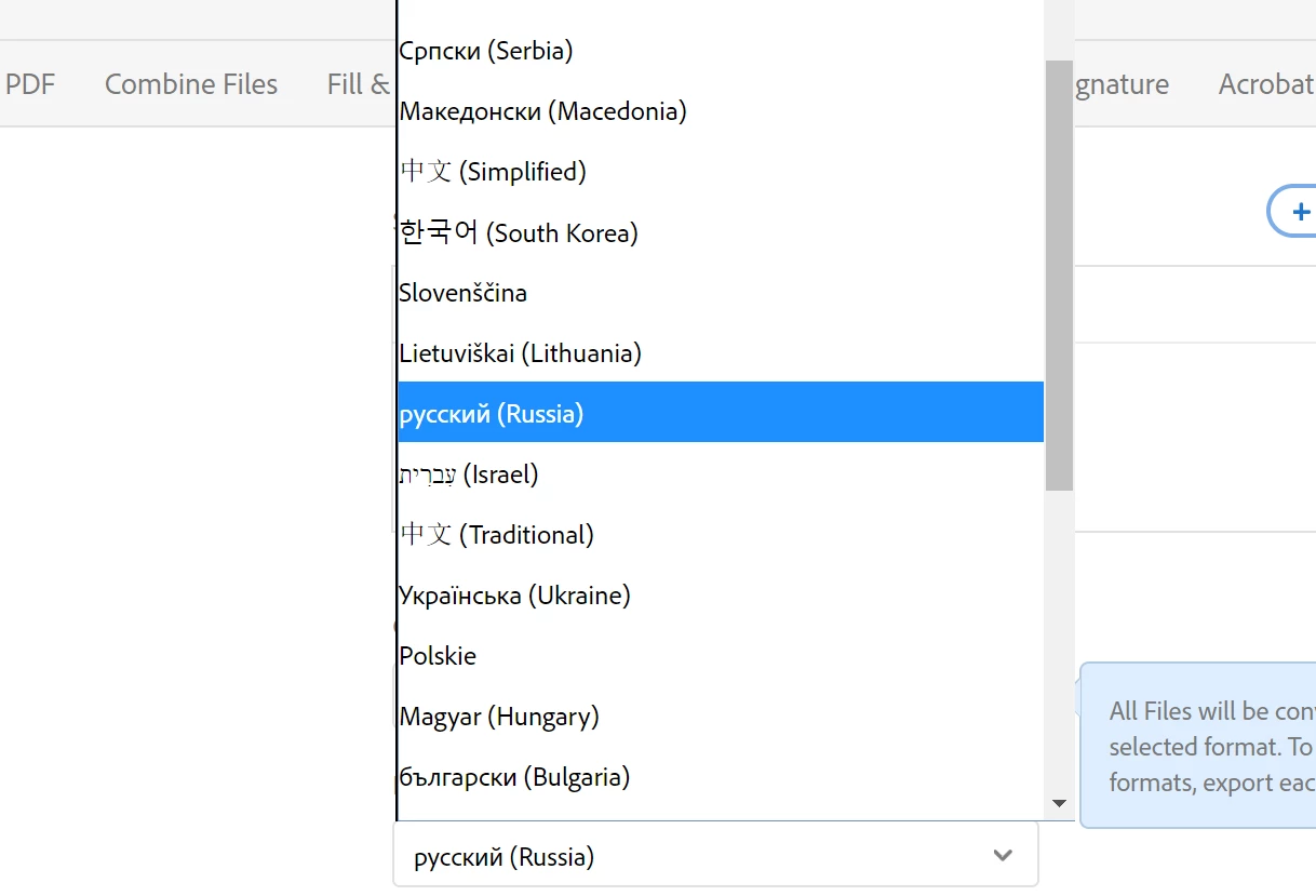 You can not do that only with the free version of Adobe Reader. It works with the document cloud subscription (Adobe PDF Pack, Export PDF). Also, if the you have the Russian font installed in your system, otherwise the conversion will automatic pic the native language.