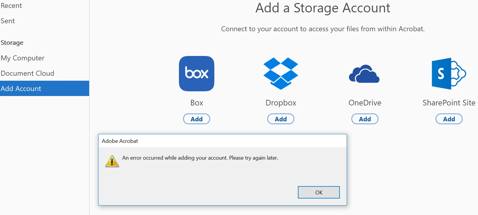 I have been having an issue with adding my MS Onedrive cloud account to Acrobat Pro DC and keep having the below message coming up.