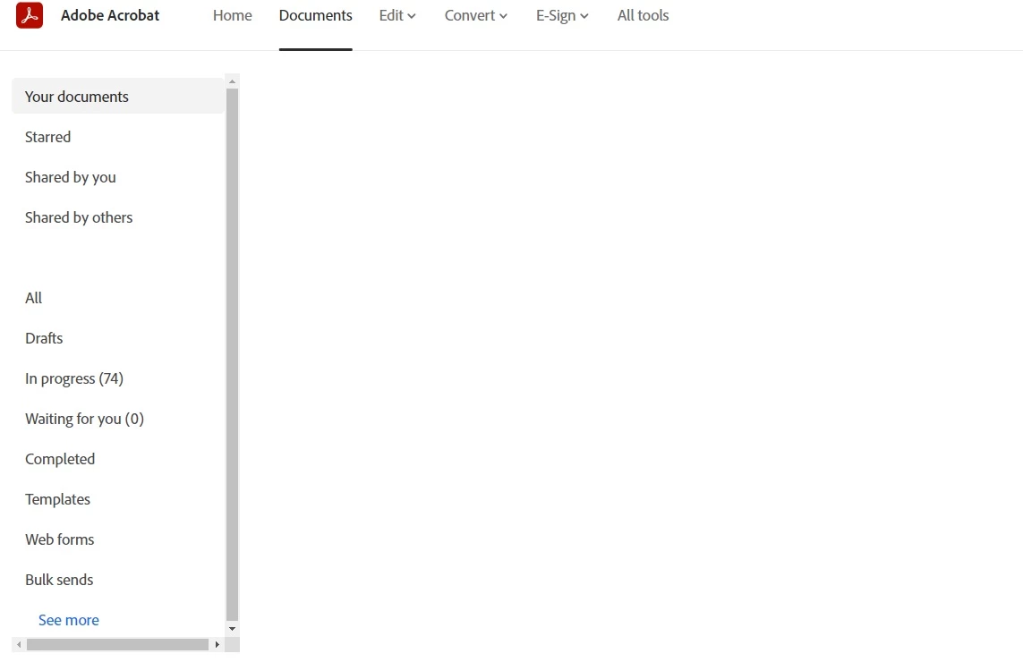 Last week (July 17, 2023), all of my documents were available, along with the folders I had organized them in when I navigated to the "Documents" portal in Acrobat Online. When I logged in this Monday, though, all documents appear to be gone. When I clicked on "Documents," I was led to a blank page, with only the navigation bar on the left hand side. All of my e-templates still exist, my signed documents and webforms are functioning as usual. I am only missing the individual documents and am unable to load new documents.