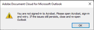I keep getting this error when trying to upload outlook attachments to adobe document cloud. I have two email addresses in Outlook and am always logged in to Adobe on one. I have tried disabling and enabling the add in and restarting outlook/computer.