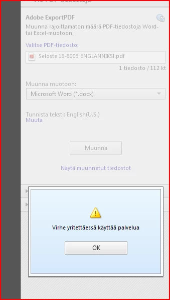 Acrobat Reader keeps saying there is a mistake as I try to use the PDF to Word service.