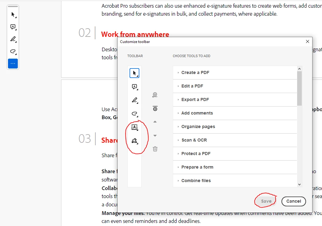 I can't add Fill and Sign (Sign yourself) tool to the tool bar, the tool button shows on the pop up window when I try to custermise it, but the "save" button is greyed out, and it never shows up the left tool bar.