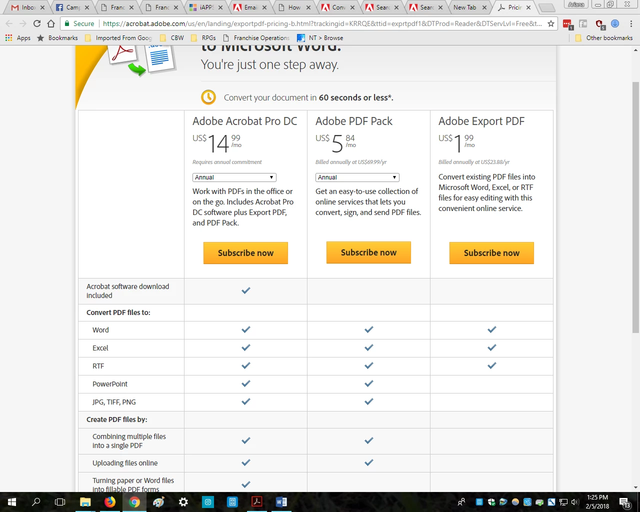 The record shows that you are subscribed to Adobe PDFPack on your current Adobe ID, using the Adobe PDFPack, you can easily convert a PDF file into JPG/PNG using the URL https://cloud.acrobat.com/convertpdf with your Adobe ID and password.