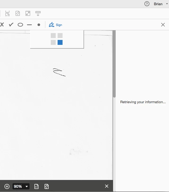 I have an active, recognised PDF pack subscription (as witnessed by "Your current plan is Adobe PDF Pack, annual" displayed at bottom of right-hand panel when I open a doc in Reader). With the pdf doc open I select "Fill & Sign" from the right-hand panel. "Retrieving your information..." is then displayed on the right panel... but it never retrieves any info. When I try to select the "Sign" function (the fountain-pen icon) a drop-down box appears that displays and endless sequence of a blue box moving clockwise around a 2 x 2 box graphic. It no longer displays my signature (graphic) nor can I get to the "Add Signature"/"Add Initials" functions...never ending spinning boxes... All the while my account info is present via the "Account Info" dropdown at the top right. Have tried rebooting. Can access my account through the web.... Arggggggggggghhhhhhhhh....