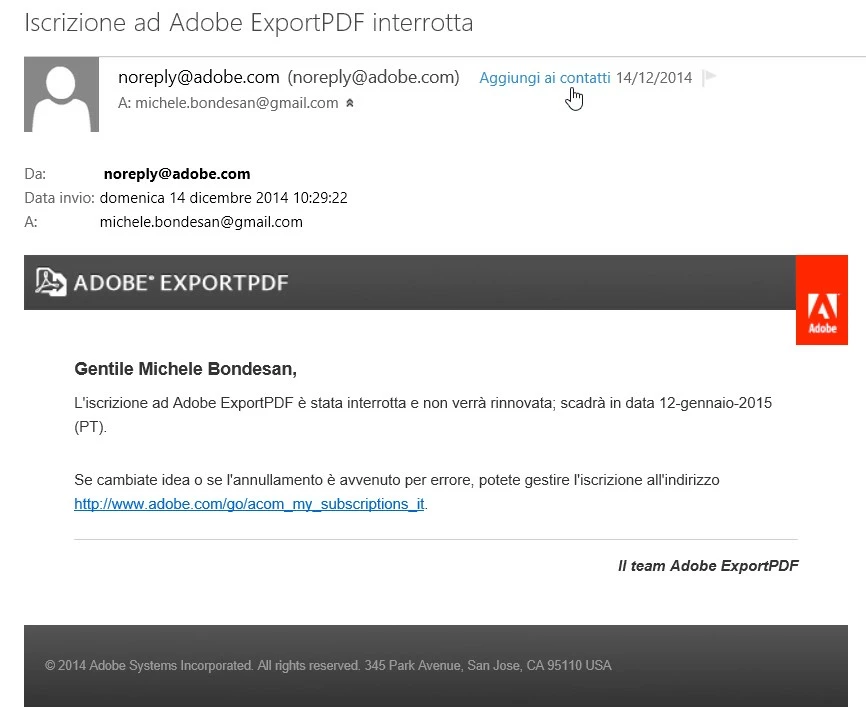 On 14 December 2014 I disabled the automatic renewal of my yearly subscription to ExportPDF, which was expiring on 12 January 2015. I received this confirmation of the successful operation (in Italian):