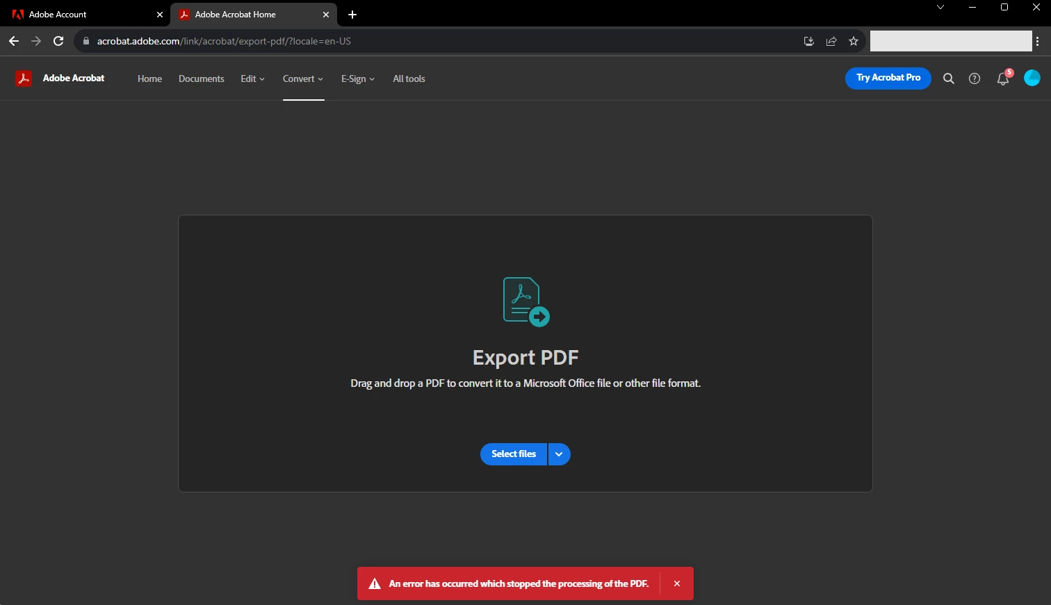When using the Export PDF service on acrobat.adobe.com or in Adobe Acrobat Reader to convert a file with the name file name "report.pdf" to any format, it fails with the error message "An error has occurred which stopped the processing of the PDF.". Screenshot attached.