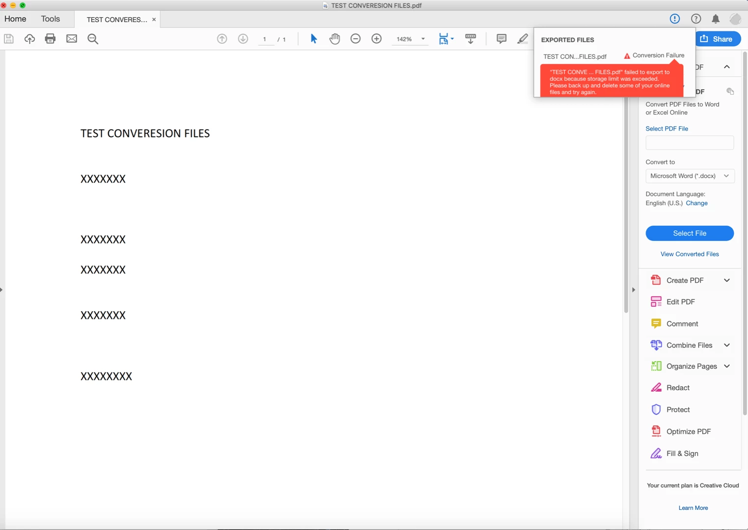 why does my pdf convert to Word option fail to convert? Error message is failed to export because storage limit was exceeded?