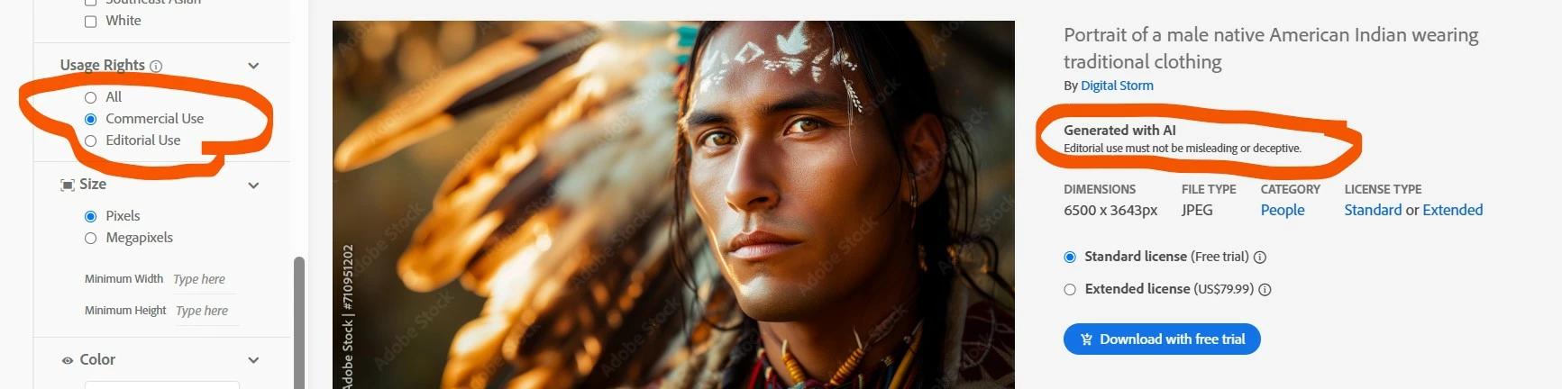 I'm trying to find some good images of Native Americans for a historical type non fiction books. EVERY image that I find that will work has Editoral only and I can tell easily they are AI.