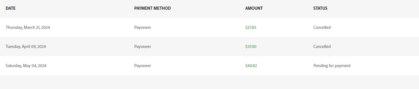 Saturday, May 04, 2024Payoneer$40.82Pending for payment