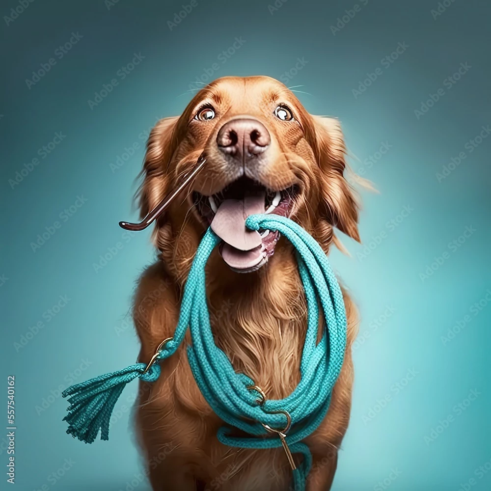 At a quick glance this image is better than most. But on a closer look, it's just poorly made trash. This dog with a leash looks as if something unfortunate has happened to the left side of it's mouth, the leash is a mess, and has a bottle opener / churchkey on the end of it instead of a clip, and why is there an ear piece from glasses sticking out the side of the dog's muzzle?