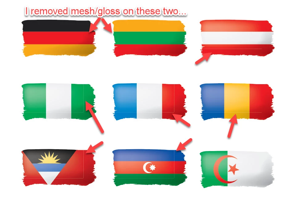 ...multiple icon packs from the same "designer." The glass/mesh overlay is leaving lines on nearly every single icon. With lackluster Illustrator skills, I am able to remove the box causing my angst, though I lose the gloss (fine, I guess), but I am not prepared to click the heck out of it until the offender is isolated, cut the box, wash, rinse, repeat for 180+ icons per pack across multiple packs.
