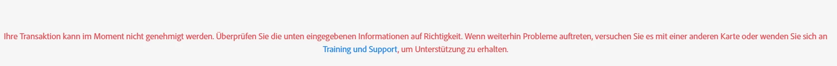 Ssergii_4948ParticipantForum|Forum|1 year agoFebruary 6, 2025QuestionBuying Adobe Stock Subscription ErrorForum|Forum|1 year agoFebruary 6, 20251 reply69 viewsWhen we try to buy "Erweiterte Lizenz" for Stock Subscription, we get the following message with error (added screenshot). How can we resolve this problem? Thank you for help.Plans and purchaseTroubleshooting