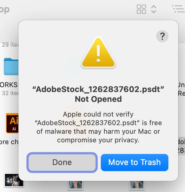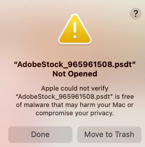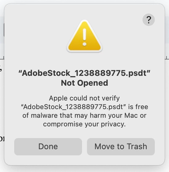 Hi all, I'm trying to open a PSDT from Adobe Stock but when I do I get a popup saying that Apple could not verify it's free of malware.