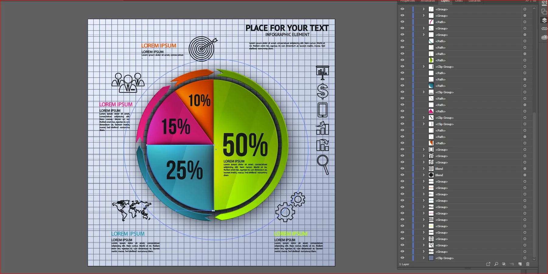 I have purchased infographics from Adobe Stock that I cannot edit the graphs/pie charts % for. There is no other reason to purchase Adobe Stock Infographic .ai files except to get the design created and be able to edit the percentages to the ones needed (because nobody uses the exact % of each item as they are displayed). I have searched till I cannot try any other suggestions anymore. I have tried ungrouping, clipping mask-release, and they are not locked. I don't have alot of experience in Illustrator so I'm hoping it is just something I am not seeing. I am using Adobe Illustrator 2019 on Windows 10. here is a screenshot.